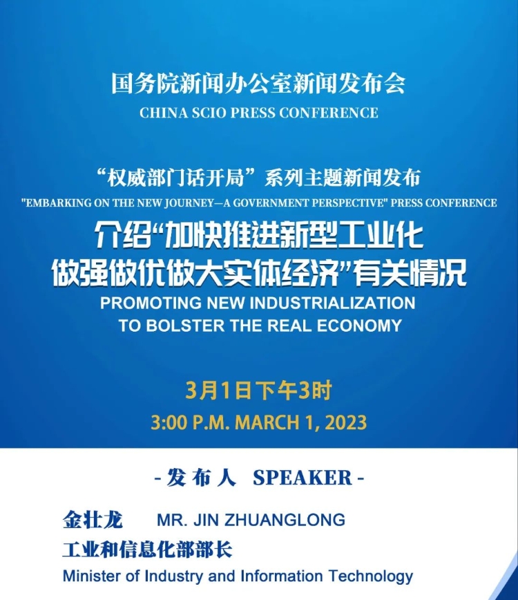 国务院新闻办公室定于2023年3月1日(星期三)下午3时举行“权威部门话开局”系列主题新闻发布会,请工业和信息化部部长金壮龙介绍“加快推进新型工业化 做强做优做大实体经济”有关情况,并答记者问。