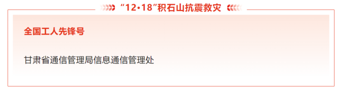 4月28日,中华全国总工会召开2024年庆祝“五一”国际劳动节暨全国五一劳动奖和全国工人先锋号表彰大会,因在“12·18”积石山抗震救灾中勇于担当,临危不乱,充分发挥基层党组织战斗堡垒作用,积极组织通信行业第一时间恢复灾区通信,为保障人民生命和财产安全做出巨大贡献,甘肃省通信管理局信息通信管理处(以下简称省局信管处)荣获“全国工人先锋号”称号。