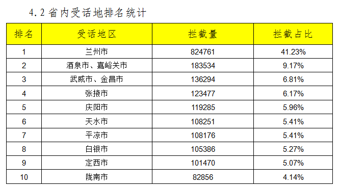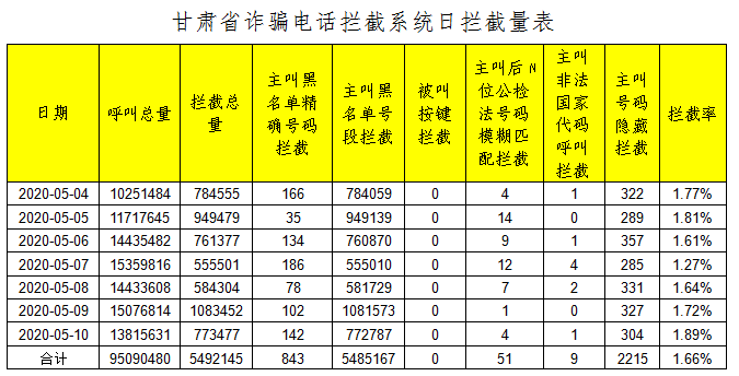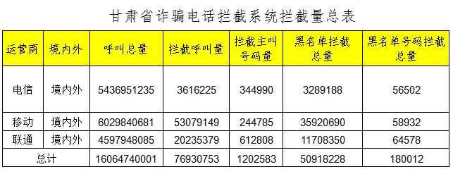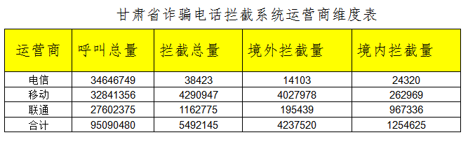 甘肃省诈骗电话拦截系统于2017年3月17日割接上线运行,截至2020年5月10日,过滤省际来话近160.6亿余次,拦截各类诈骗电话7693万余次,其中拦截主叫号码量120万余次,黑名单拦截量5091万余次,拦截诈骗电话效果显著。