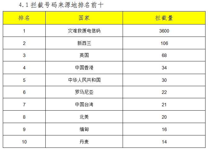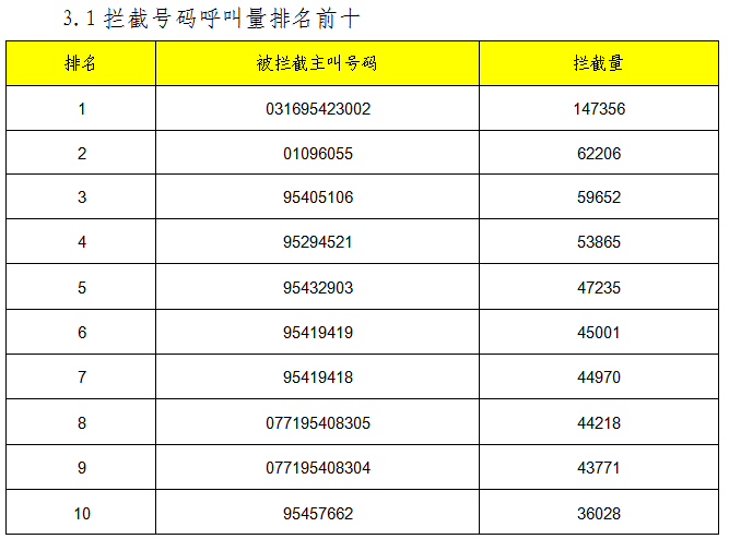 从拦截号码呼叫量来看,需要注意加强对如031695423002,01096055,95405106, 95294521,95432903等类号码的防范。