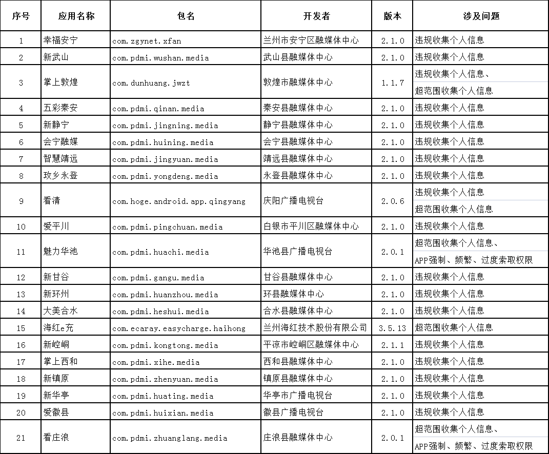 依据《中华人民共和国网络安全法》《中华人民共和国个人信息保护法》《中华人民共和国电信条例》《电信和互联网用户个人信息保护规定》《规范互联网信息服务市场秩序若干规定》等法律法规,甘肃省通信管理局按照工业和信息化部《关于开展纵深推进APP侵害用户权益专项整治行动的通知》(工信部信管函〔2020〕164号)《工业和信息化部关于进一步提升移动互联网应用服务能力的通知》(工信部信管函〔2023〕26号)要求,持续开展APP侵害用户权益专项治理工作,不断改善移动互联网应用服务环境。2023年3月甘肃省通信管理局对省内相关APP进行检测,发现“幸福安宁”、“新武山”、“掌上敦煌”等APP存在违法违规收集使用个人信息行为。截至目前仍有21款APP未完成整改,现予以通报。